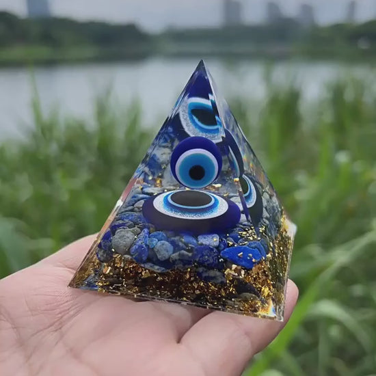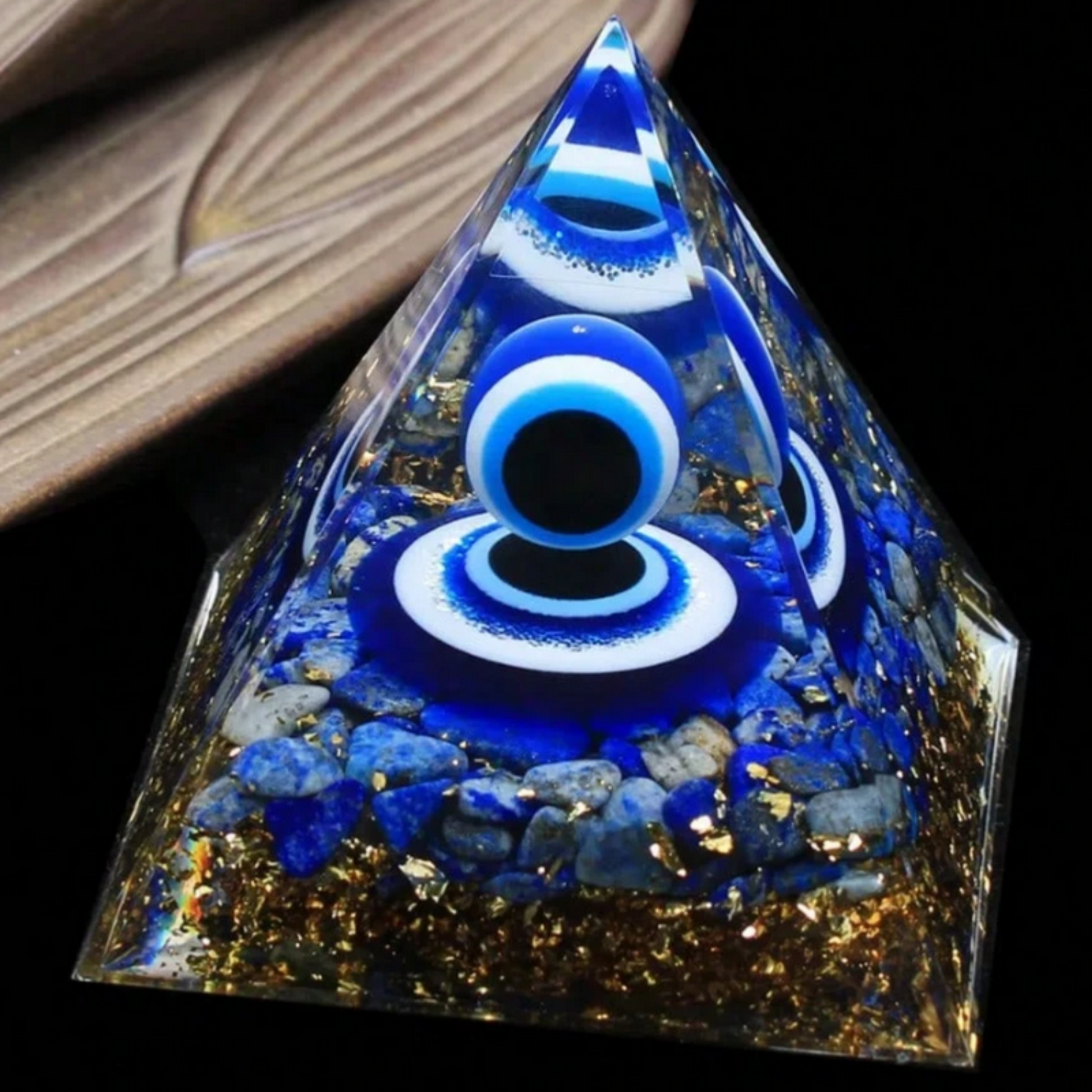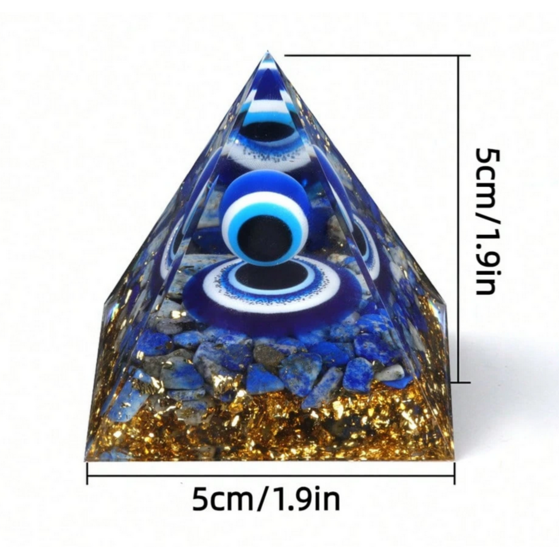 - HANDCRAFTED DESIGN: Beautiful pyramid-shaped ornament featuring a striking evil eye symbol in deep blue and white, set against a clear crystal glass background